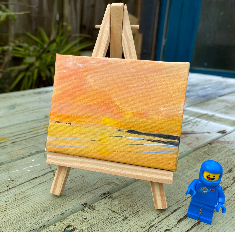 A mini acrylic painting of sunset at Constantine Bay. This original mini painting on canvas comes complete with its own mini wooden easel for easy display on your shelf or desk. A perfect gift for a loved one, or why not gift yourself!? (Lego figure not included)