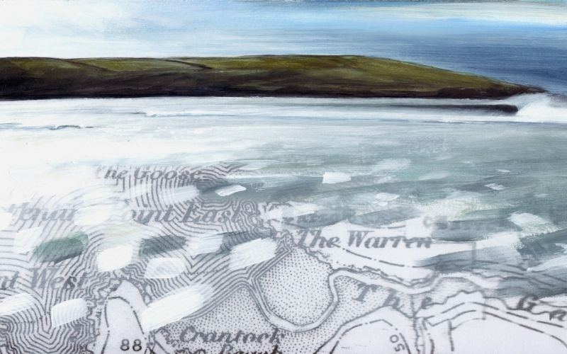 When the conditions are right, Crantock is one of my favourite beaches to surf. This is a print of a painting I made by overlaying a vintage shipping map of the area.