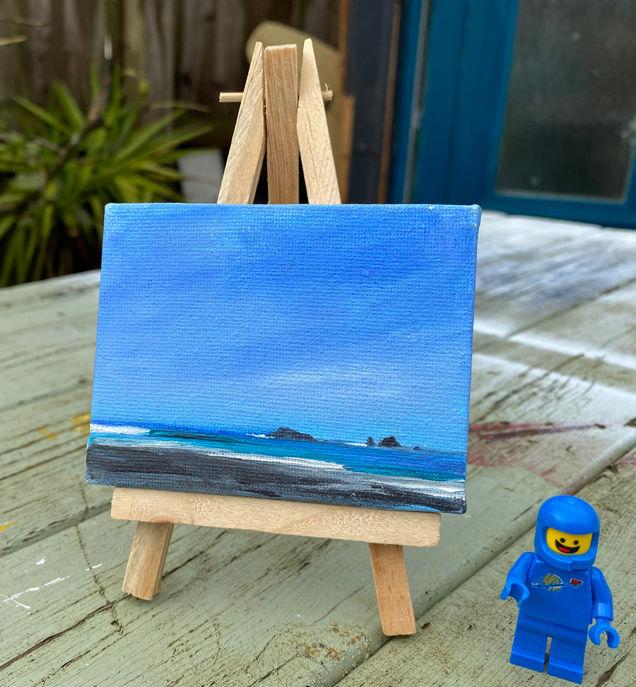 A mini acrylic painting of the reef at Constantine Bay. This original mini painting on canvas comes complete with its own mini wooden easel for easy display on your shelf or desk. A perfect gift for a loved one, or why not gift yourself!? (Lego figure not included)