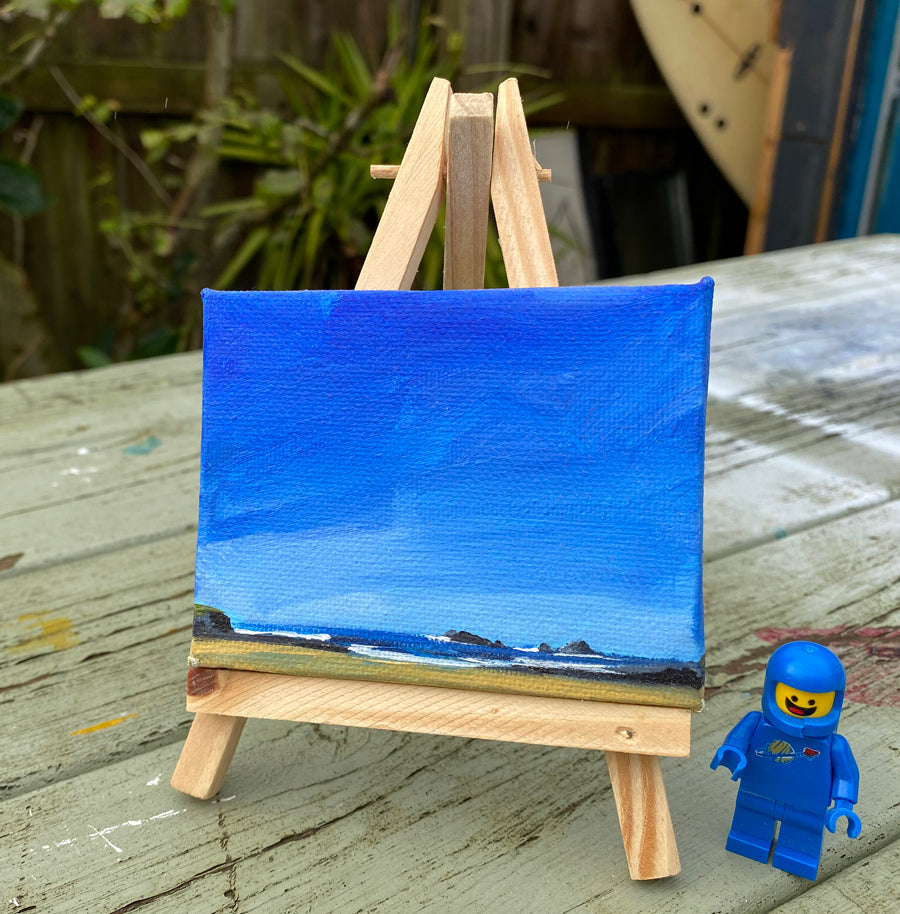 A mini acrylic painting of Treyarnon Bay. This original mini painting on canvas comes complete with its own mini wooden easel for easy display on your shelf or desk. A perfect gift for a loved one, or why not gift yourself!? (Lego figure not included)