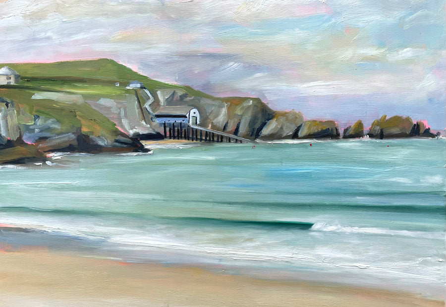 Mother Ivey's Bay with the iconic RNLI Padstow lifeboat station looking out to Stepper Point and beyond...According to local legend, Mother Ivey was a white witch and healer, who cast a curse over the field of a local wealthy family known as the Hellyer’s – who ran a lucrative pilchard processing business after they refused to help feed starving villagers.